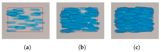Execution of a monochrome structured region with a horizontal structure vector. The target area is shown with a red box and covered within three iteration steps. (a) Initial stroke set; (b) first feedback step; (c) second feedback step.