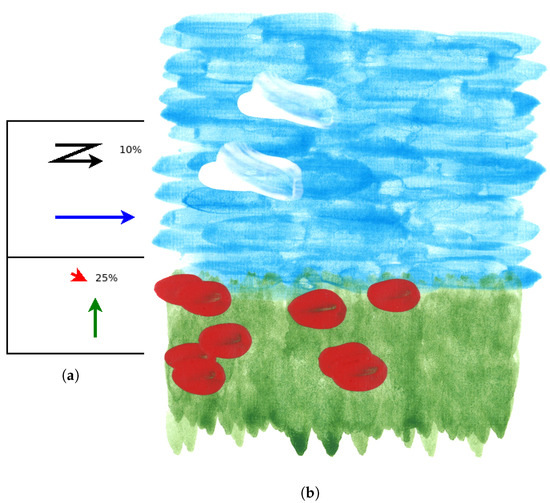 A simple landscape painted with structured regions. It consists of two rectangular areas, with different attached attributes. The sky consists of a blue coverage with horizontal orientation with an added white zigzag stroke covering of the area. The grass is made up of vertically oriented green strokes, which are also shorter. Additionally, a coverage with simple red dots as flowers is layered on top. (a) Sketch of the structured region input: each region is defined with a primary structuring member and some additional elements to be painted on top with a specified density; (b) the painting created from the given input data.