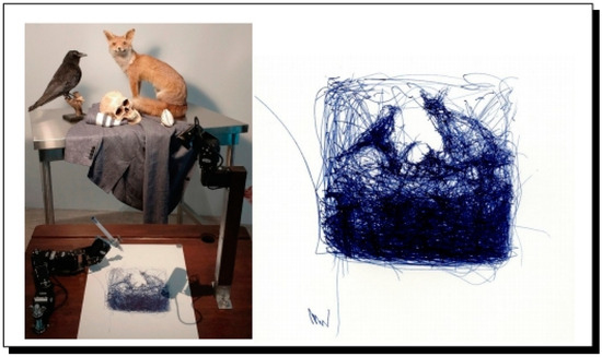SS3: When it comes to drawing, one example of that potential embodiment is the robot, Paul. As illustrated in Figure 1, Paul completed a still-life based on a La Fontaine fable, drawn in the style of Patrick Tresset.8 Paul combines an electronic eye connected to a computer that is connected to a mechanical arm holding a ball-point pen. As the eye scans the subject, the arm holding the pen swings around and around rapidly and apparently randomly, but in the end, the subject matter emerges vibrantly from the scribbles. What were your aims in this project?