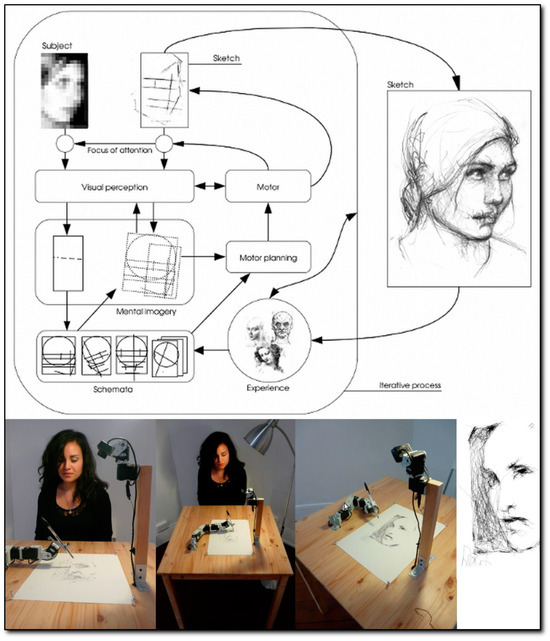 Top: Example of a high-level system view of the processes and their interaction necessary to study, simulate, and reproduce the activity of an artist—here in the context of a portrait drawing for the AIkon project (circa 2010). Bottom: An example of the embodied system—aka Paul the Robot—performing a live portrait.