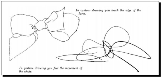 In my book (Simmons 2021, p. 194), I compare Paul’s process to gesture drawing, a well-known exercise often used for sketching animals and humans (Figure 2); it can also be applied, as here, to a complex composition (Figure 1). When a human draws, the process exemplifies embodied cognition in multiple ways. Allowing the eye to scan freely with the hand following it as quickly as possible makes sense if the subject is a living person or animal, but in Kimon Nicolaïdes’ The Natural Way to Draw (Nicolaïdes 1941), the process is illustrated by a ribbon tied into a bow, comparing a contour drawing of the subject to a gestural sketch (Figure 3). Both drawings could be considered embodied because, according to Nicolaïdes, in contour drawing the students imagine the pencil touching the edge as they draw, moving slowly and carefully, while in gesture drawing, they try to feel the movement of the object as a whole, which means drawing quickly and energetically.