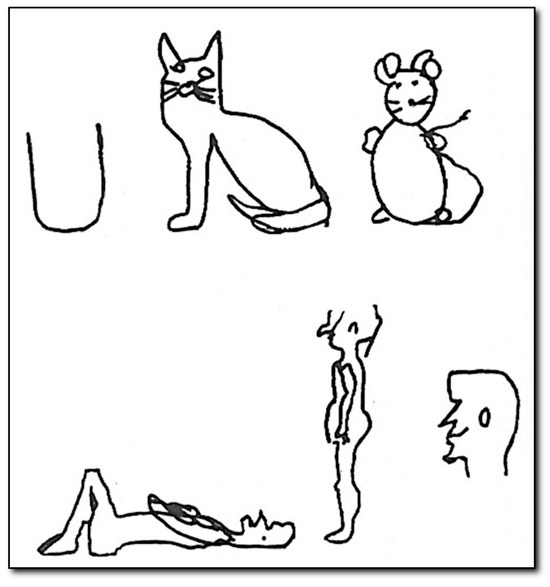 Drawings (a glass, a cat, a mouse, a man lying down and standing up, and a head) by Tracy as an adult, and blind since age two. (Kennedy 1993, Fig. 4.16, reproduced by permission of the author).