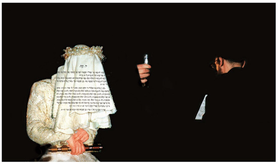 This montage, which consists of a series of photographs taken by Golan during Hasidic weddings, is a stylized reenactment of a real daily event. Here too, the darkness identified with femininity is contrasted with light, symbolized by the candle held by a man’s hand. The black contrasted with white; most importantly, the female’s identity is concealed. In this case, the bride’s face is covered with a traditional veil, but one on which text is printed. The text on the veil is the first page from the chapter on Eve in Hayim Nahman Bialik and Yehoshua Hana Rawnitzki’s Sefer HaAggadah (The Book of Legends), a classic modern compilation of Jewish lore.11 The page depicted contains several dicta from Midrash “Genesis Rabbah”, compiled around the third century CE. The passages cited here place blame on the woman regarding the expulsion from heaven/Eden. This concept is emphasized in the last dicta on the veil: “Rabbi Hanina the son of Rabbi Idi said: Since Eve was created, Satan was created with her” (Genesis Rabbah 17).