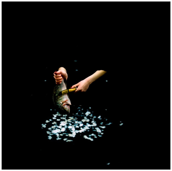 For the first category (Figure 4 and Figure 5), cooking is portrayed as a primary activity for women, virtually defining their identity. Accordingly, the raw ingredients and cooking implements take center stage in the photographs. Indeed, in Samira (Figure 4) and Heba (Figure 5), these objects are the real heroes of the picture, partially hiding the woman’s hand. They are lit by a bright, almost silvery, light, in sharp contrast to the black background. The viewer’s eye is drawn to the lower region of the scene, where the product of the activity is seen: the flour sifted by Samira, the fish scales cleaned by Heba. As in all works in the series, the contrast between the total anonymity and darkness hiding the figure and the prosaic nature of the activity implies two separate states: routine everyday life and the inner world of the present–absent figures, conveying a sense of ritual and spirituality that accompany the mundane act of cooking.