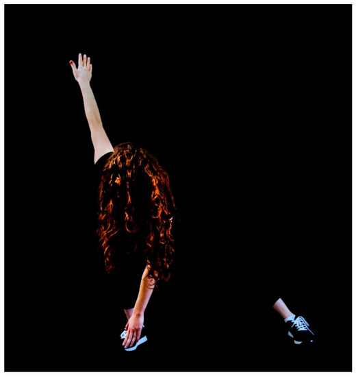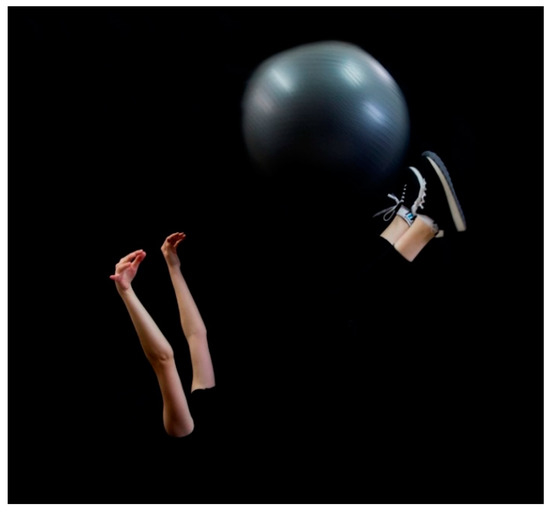 The photographs in the second category (Figure 6 and Figure 7), which depict Ziyan’s friend Katherine exercising, are the only ones in which we see the figure’s head. Nevertheless, only her hair is visible, not her face, so that despite the name and relationship between the two women, she cannot be identified with any certainty. Unlike the other pictures in the series, here the subject is the movement of the female body. Nevertheless, the basic synthesis of contrasts is preserved: the movement itself is not depicted but merely hinted at by its “edges”, the hands and ankles. Katherine’s head and the ball serve as additional anchors in the composition, enabling the viewer to identify the action and the position of the body. Yet, for the subject of the photograph, Katherine, her thoughts, feelings, and inner world remain concealed, hidden in the light and fully existing only in the viewer’s imagination.