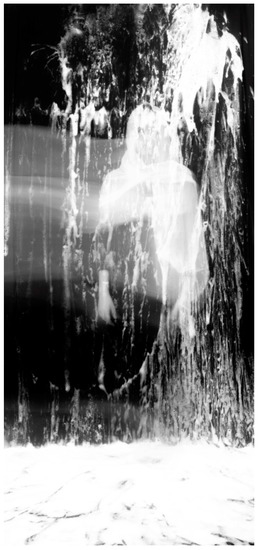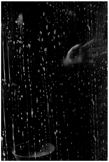 Ziyan treats the act of cleaning powerfully in her photographs of Druze women. Rather than providing visual indications of the model’s gender and inner world, the images focus on the act itself and its consequences: streaks of soap and water. In Nada (Figure 8), the artist retains the model’s female name, but Nada’s body is only hinted at by the movement of a hand. The camera’s slow shutter speed blurs the contours, nearly concealing the figure. Instead, the focus is on soapy water dripping down a window and the bucket in the lower section.