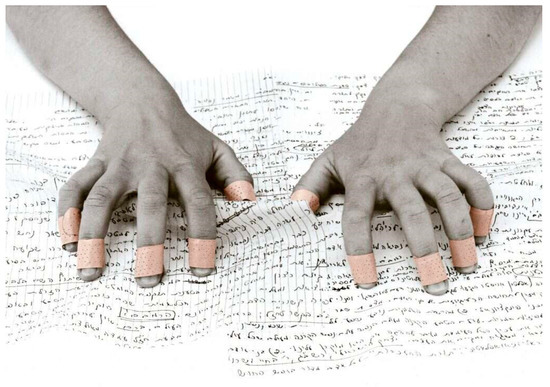 The contrast between the appearance of the woman’s hands and her spirituality, especially the fact that the cross between palms and text are the main visual code of this work, is reminiscent of yet another work by Nechama Golan, “Reality Hurts” (Figure 14). Here, two female (but, again, lacking in any sign of femininity) palms hold pages of handwritten text with a grip that seems both desperate and lustful. All the fingers are covered with bandages, which also convey a duality between protection against injury and healing. The artist wrote this text while studying Jewish philosophy as part of her repentance process. It symbolizes, on the one hand, the power she draws from her studies and, on the other hand, the complexities inherent in the religious prohibition on women’s studies.