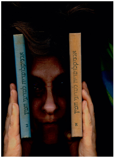 In this series, the artist utilizes a technique she calls “Scennogram” (a term Heiman coined with linguistic editor Dafna Raz). A scanner is controlled by pressure and movement of both the human body and machine as an artistic medium. Each of the works of the series depicts book spines that include the title, author, publisher’s logo, volume number, etc. In Figure 15 and Figure 16, as in the entire series, Heiman presents non-fiction books from her personal library, whose themes are central to her life as well as to feminist discourse, including theories about sexuality and sex crimes, psychological theories, suicides, and poetry by women. According to her, the books are “One large readymade … like a resonance box: they connect with the vanishing point of waking up to them in the morning” (Omer 2008, p. 183).