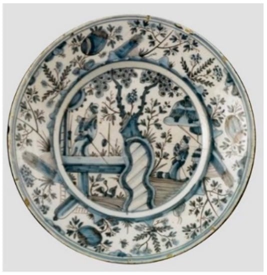 The Portuguese faience dish, inv. MNAA 2402 (Figure 2), which was made during the second half of the 17th century, is currently being displayed on the exhibition stand named “Small Motif” (“Desenho Miúdo”) in the National Museum of Ancient Art in Lisbon (Museu Nacional de Arte Antiga). José Queirós in his fundamental book on Portuguese Ceramics mentioned the creation of this new designation in the Portuguese ceramic classification—”Small Motif”, which constitutes a phase of transition from purely oriental motifs to a hybrid decorative grammar, in which western elements appear to punctuate the pieces (). This so-called “Small Motif” in the chronology established by Reynaldo dos Santos was considered common among the oldest motifs inspired by Chinese porcelain (). Researchers from Portugal discovered that the “Small Motif”, in the second half of the 17th century, roughly between 1660 and 1680, appeared in Lisbon in limited quantities and was produced almost exclusively for domestic consumption (; ). The “Small Motif” pieces dated between 1660 and 1668, according to Alexandre Pais and João Monteiro, could be a decorative style exclusive to one pottery in Lisbon (). In the second half of the 17th century, the introduction of the manganese-purple pigment in Portuguese ceramic ornamentation coincides with the emergence of this decorative style (). The human figure, water, pavilion, pagoda on this piece of “Small Motif”, which are typical elements of shanshui motif, mirror the influence of Chinese motifs on Portuguese faience.