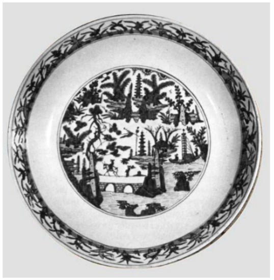 On the Chinese porcelain dishes (Figure 3, Figure 5a,b, Figure 6 and Figure 8), considering the characteristics of the two figures and the oblong object, we infer that the depiction of the two figures crossing the bridge is based on the historical scene—Xie Qin Fang You (Taking a qin to visit a friend). The image alluding to Xie Qin Fang You derives originally from the story of Yu Boya and Zhong Ziqi in the spring and autumn period (from approximately 770 to 476 BCE), recorded in the classic text entitled Lüshi Chunqiu (Master Lü’s Spring and Autumn Annals). It is said that Yu Boya was good at playing Guzheng, while Zhong Ziqi was good at listening to music and could even hear the emotion and thought conveyed by Boya’s music. Afterward, Boya, holding his musical instrument, visited Ziqi until he died. The news of Ziqi’s death distressed Boya and led him to abandon his Guzheng, saying that he would never find his Zhiyin (知音, soul mate) (). The word Zhiyin literally means knowing the song; it relates to the story of Yu Boya and Zhong Ziqi. Today, this term is widely used to describe intimate friendship. The story of Yu Boya and Zhong Ziqi was constantly developed and gradually constituted the stylized motif of Xie Qin Fang You. Initially, Xie Qin Fang You only appeared in the form of Chinese painting on rice paper (Xuan Zhi) and later became a famous motif on Ming Dynasty porcelain. Furthermore, the theme only expresses friendship, but also expresses the elegant feelings and noble souls of literati, that is, to stay away from the hustle and bustle of the world and its vulgarities, return to the embrace of nature, and reflect the harmonious relationship between human and nature, enriching the expressive context of the “literati painting”.