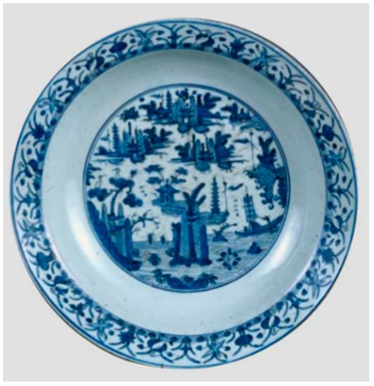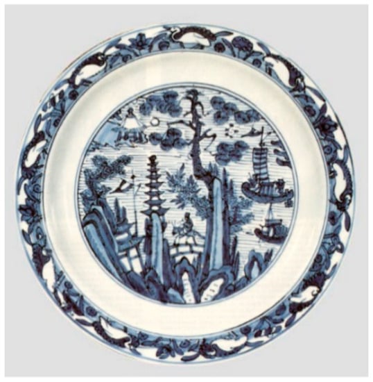 To figure out the differences between Portuguese and Chinese views, two representative pieces with the shanshui motif are shown in this study, a Portuguese faience dish from the second half of the 17th century (Figure 2) and a Chinese porcelain dish made during the Jiajing period (Figure 3). Both are analyzed concerning their decorative details and artistic compositions.