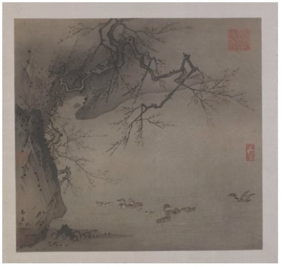 In the painting Ducks in Water Beneath Blossoming Plum (梅石溪凫图) (Figure 9), Ma Yuan employs the typical diagonal composition, with the rocks and blossoming plum trees located in the upper left corner. The branches of the plum trees emphasize the formality of this composition, while the ducks on the lower right play an important role in balancing the image and completing the vibrant scene. Ma Yuan frequently used one corner to emphasize rocks or other elements, creating a contrast between reality and fiction, earning him the moniker “Ma Yi Jiao” (One-Corner Ma).