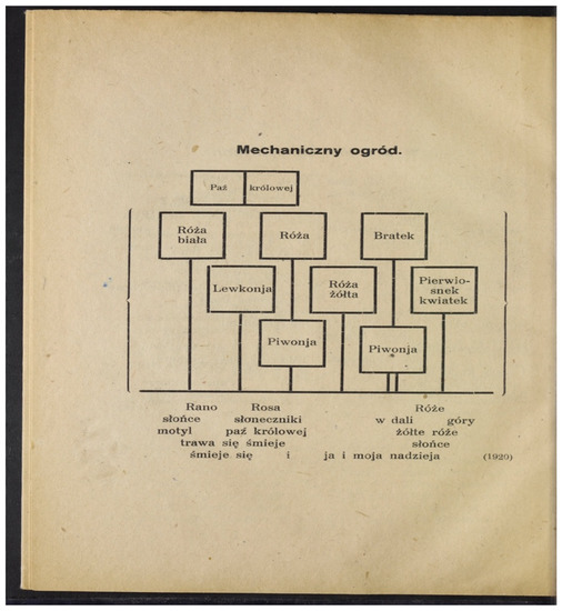 Between the literary gardens of past centuries, we find additional examples from Garden of Epigrams by Wacław Potocki (Potocki [1648] 1907) and Tytus Czyżewski’s The Mechanical Garden (Czyżewski [1920] 1922, p. 24) (Figure 5).