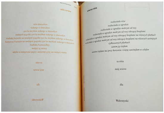 The poem Rose, from the volume omnipoems (Miłobędzka [2000] 2020p, pp. 256–57) belongs to Miłobędzka’s visual and garden poems. However, it is also something more: it is a full calligram enriched by its reflection. The individual words are arranged verse by verse to form a graphic rose: “rose bloomed/ bloomed in the garden/ bloomed in the garden wet with dew/ bloomed in the garden wet with dew sparkling drops/ bloomed in the garden wet with dew sparkling drops on pink petals/ bloomed in a garden wet with dew sparkling drops on pink curled/ veined petals/ before I cut it down/ before I cut it right at the root and wrapped the cut in cellophane/ this rose/ my poem/ for Valentine”. Miłobędzka inscribes herself with her poem by developing it with the symmetry and meaning of the rose in bloom. She creates a poem-picture, in a certain rhythm, thus referring to Tadeusz Peiper’s concept of a blooming poem (Peiper [1926] 1972) and the love symbolism of the rose, thus inscribing herself in the rich history of poems dedicated to roses. The reverse image is similar to a flower, imprinted in the herbarium, a memento of the queen of the garden—the rose (Figure 8):