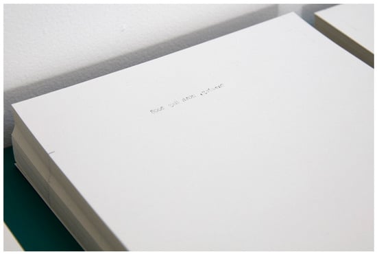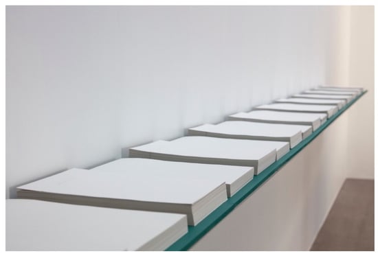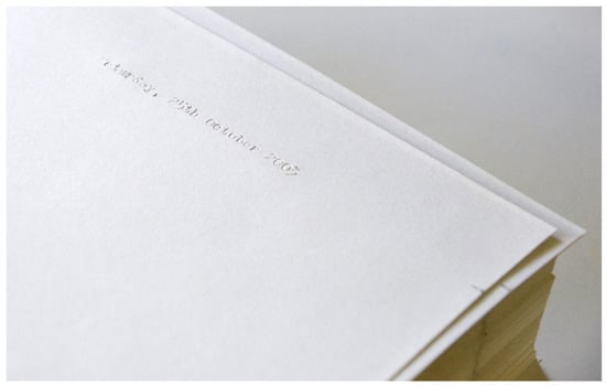 A major work in the series is The days we’ve been together (Figure 1 and Figure 2). The basis of this work is an observation of time both gathering and passing within a relationship and how it can be understood through the form of a date on a page. The work is a series of 4000+ sheets of paper, each of which marks a date that Justin and I have been a couple. The metaphorical lines of dates incrementally changing through a stack of thousands of sheets of paper describes an arc of time from then to a perpetually moving now. In addition, in that positive recording of dates, accruing and accreting, the work also engages with the negative space of what fades, what is left unsaid and unacknowledged, what came before and, ultimately, the fact that it will end. The description of this work lies in how the words of the dates describe that span of time. The dates both mark out the temporal boundaries of our relationship as well as give an account of our relationship (albeit not a detailed one) in words.