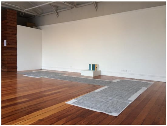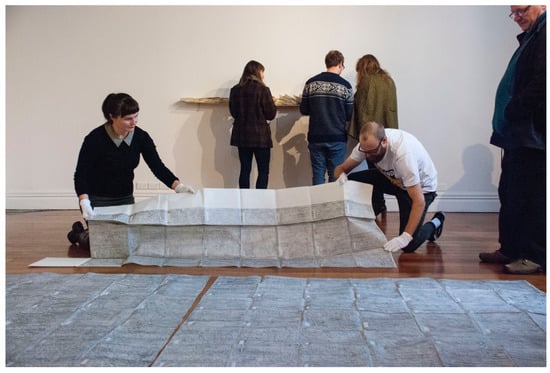 It is also a drawing that is mostly unseeable. When it has been exhibited, a selection of one space is unfolded and shown in the gallery; the remaining folders are displayed alongside. To date, only the entranceway and hall have been exhibited, with its irregular sequence of narrow rectangles offering the most visually engaging view, as well as a metaphorically apt glimpse of the rest of the work, positioning the viewer at the opening of the house and the drawing. Also, in a one-off public performance, Justin and I unfolded our bedroom, briefly opening that most intimate of spaces for the audience (Figure 6).