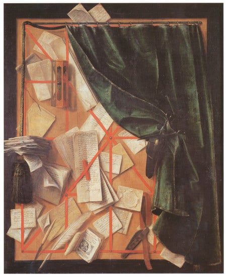 In painting, it designates a trompe l’oeil of a table or board surface, littered with things such as papers (notes, letters) and other typical studio paraphernalia (writing utensils, palettes); and even sand clocks, or the odd musical instrument (violins, lutes) (