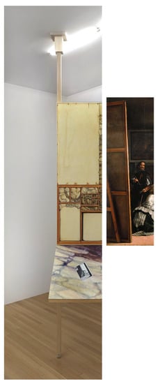 Figure 8, left). Each of these larger, vertical pieces had a counterpart, displayed almost perpendicularly, like an angled desk, right below them. The larger, vertical paintings were replicas of actual, three-dimensional artworks the artist grew up with. And each attached ‘table’, a quodlibet, featuring depictions of family pictures where the former appeared:
