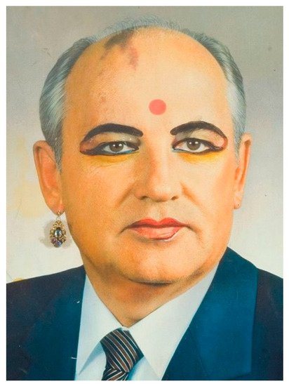 The emphasis on the queer as the liminal zone of liberation from gender stereotypes, can be best illustrated by the work that has brought young Mamyshev international fame—his portrait of Gorbachev as an Indian woman (1989) (Figure 1). By transforming an official photo of the general secretary into a kitschy portrait with rosy cheeks, colored lips, heavy makeup on eyes and eyebrows, wearing an earring and necklace, and, most importantly, with a red Hindu bindi on the general secretary’s bald forehead, surprisingly, did not denigrate Gorbachev, as one would expect. This representation transformed him into an androgenous divinity, a naïve image of an otherworldly messenger of peace—rather than the new ruler of the Soviet empire. At the same time, there is an obvious irony in the ease with which a black and white official portrait can be transformed into an androgynous icon of the kitschy “Oriental beauty”. The positive message of this morphing was obvious and liberating for anyone—which explains why this image appeared on the covers of so many Western magazines in the early 1990s.