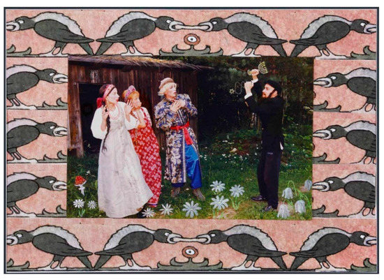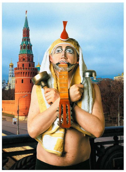 In the later series, such as “The Russian Questions” (1997), “Tales of the Time Lost” (with Sergei Borisov, 2001), “Star3” (CтapЗ, 2005), and “Russia that We’ve Lost” (2007), Mamyshev impersonations were increasingly satirical. In “The Russian Questions” he created a contrast between stylized frames borrowed from Ivan Bilibin’s famous series of illustrations for Russian fairytales and scenes performed by Mamyshev and his friends (Timur Novikov, Georgii Gurianov, Elizaveta Berezovskaya, Irena Kuksenaite, and others). Using costumes from Soviet films such as the legendary Amphibian Man (1961), Mamyshev created grotesque “screenshots” from nonexisting Soviet cinematic fairytales, exemplified by Aleksandr Ptushko and Aleksandr Rou. The artist imitates their visual stylistics but applies it to subjects unimaginable in Soviet films—such as, for example, a confrontation between the Russian prince with a Jew or the representation of a sexually alluring mermaid (Figure 6 and Figure 7). In “Star3”, he depicted various world celebrities against the same background of the Moscow Kremlin, but while doing this he emphasized the unhappy or plain scared expressions of these “foreigners” in Moscow. DIY improvised media was used for their images—duct tape for Chaplin’s and Hitler’s mustaches, a garbage bag for Bin Ladin’s beard, a plastic shopping bag for Marilyn Monroe’s “cocktail dress”, and a ladle and plunger for the Egyptian pharaoh’s symbols of power (Figure 8 and Figure 9)—conveying the simulative, fake nature of the created characters (despite their uncanny similarity to originals), and by this means, revealing the superficiality and hyperreality of westernization in post-Soviet Russia.