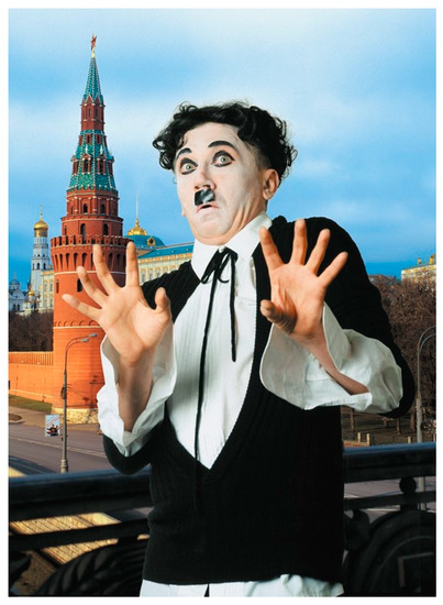 The Gorbachev portrait was followed by Mamyshev’s long-going series “The Politburo” (1990, 1995, 2002, 2011), in which grotesquely exaggerated, almost clownish make-up turned Politburo members into funny and unappealing (unlike Gorbachev) drag queens. Mamyshev was not employing homophobic tropes as a satirical device here. By dressing Soviet functionaries in drag, he performs the transfiguration of scary death masks into carnivalesque figures comparable to Cindy Sherman’s clowns (Figure 2 and Figure 3). The artist in one of interviews recalled that his mother, the party apparatchik, when he was a child, taught him to recognize all the Politburo members by names by playing with him a lotto-like game with their little portraits cut-off from a newspaper. The morphing of these deflated icons of power, thus, defamiliarizes the familiar, makes it strange—as per Shklovsky—and hence, valuable again, but this time, aesthetically rather than politically. After Mamyshev’s “editing”, the new versions of the Politburo’s “official” portraits appear to be filled with life and color, although the grotesque tension between their former (deathlike) and present (carnivalesque) representations remains tangible.