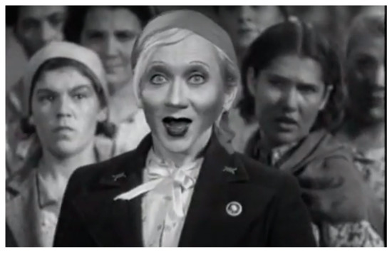 A much less attractive Orlova appears in the remake of Volga-Volga. Mamyshev’s face with heavy make-up was pasted over the “real” Orlova in scenes from Alexandrov’s film. (Figure 15) In Volga-Volga, the real Orlova plays one of the few female tricksters in Soviet culture, who, by her own hyperperformativity, confronts the rigid bureaucrat Byvalov. Mamyshev-Monroe’s performance transforms Strelka into an alien monster with a motionless face and frozen smile. Nothing is changed in the dialogue, but it is Mamyshev who says Strelka’s text, with the tone of his voice rapidly jumping from the artificially girlish to the hypermasculine. All songs were also performed by Mamyshev, who intentionally distorts the music terribly.