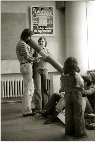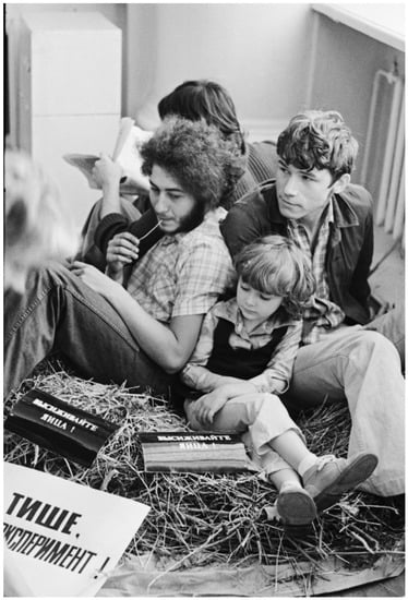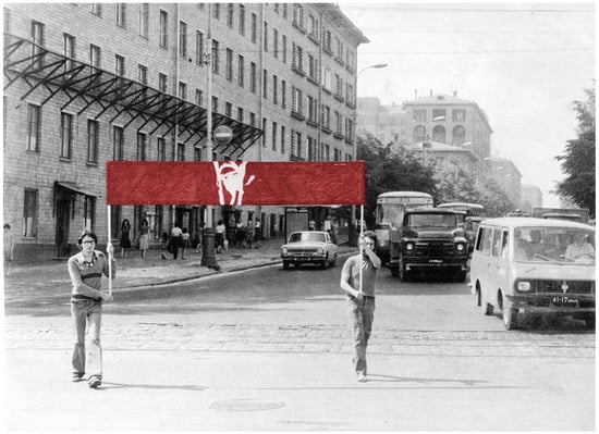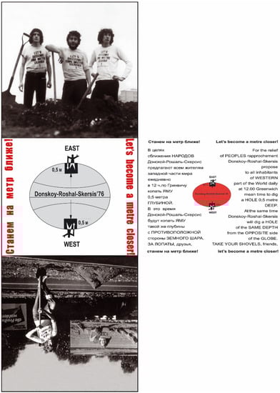 Their approach did not include close attention to aesthetic beauty or the physical attributes of objects for “art’s sake”, naturally, but signaled instead these artists’ insistence on the real-world connections of their artistic activity. By fully “realizing” the rhetorical metaphors that surrounded them and reinvesting official and shared language with hard-edged contours, the Nest occasionally bordered on a pleonastic use of language that critics and even some fellow artists dismissed. Curators of the 2005 retrospective exhibit Accomplices, for example, called their approach “naively idiotic”(Erofeev et al. 2005, p. 40). Some of the Nest’s own later explanations of their work seem to encourage such an interpretation: Nest artist Roshal, for example, noted the group’s tendency to take the principle of “art as action, action as life and so on” to “the absurd” (Roshal 2008, p. 53). Art historian Octavian Eşanu explains this Nest technique as the artists’ supposed interest in “literal illustration” and dismisses it as “short-lived puns…quickly understood” (Eșanu 2013, pp. 98–99). Yet such interpretations miss the point, mistaking extended length, intricate structure, and retention of final artistic control for conceptual depth. As a comment by Gayatri Spivak makes clear, however, the disarming micronarrative is a powerful tool in disrupting power imbalances. Commenting on the need to overcome lingering colonial histories, for example, she argues that “the alternative to Europe’s long story—generally translated ‘great narratives’—is not only short tales (petits récits), but tampering with the authority of storylines” (Spivak 1990, p. 228). In the late-Soviet environment also, “short-lived puns…quickly understood” were often the best antidote to a totalizing State monologue.