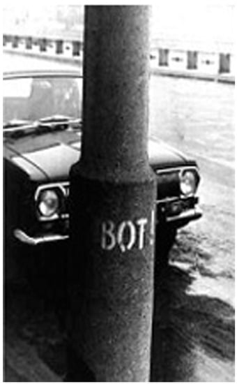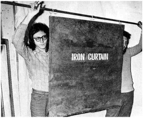 The Nest’s 1976 work Iron Curtain is the most obvious example since it interrogates the predictive power of words and their visual representation (Figure 5). The simplicity, density, and tactility of their “Iron Curtain” seems the literal embodiment of oppressive language, Churchill’s words in the original English appearing to reflect the Nest’s own doubly marginalized position in relation to them. The question of artistic hegemony arises naturally once that abstract concept is made concrete. Yet the Nest’s found object disturbs both sides of the East-West equation, condensing and concentrating the post-war period, offering the phrase and its history for spectator delectation, reinterpretation, and re-use. By rendering the phrase and the concept it represents in concrete form, the artists reveal the ephemeral underpinnings of that tyrannical threat. Their palpable object is real iron, and it rusts. The Iron Curtain works as embodied thought, its tangibility serving to capture the political debate and render those polarities human-size and harmless. It is aimed, then, not at “seizing the apparatus of value-coding” (Spivak 1990, p. 228), but at alerting spectators to the totalitarian project and urging them to evaluate it for themselves. These supposedly silent late-Soviet subalterns are multilingual, their real-world curtain—scavenged from a Soviet building site—extending the invitation to speak to other citizen-artists. Authority now resides not with the artists—or even the artistic spectator, as we are accustomed to claiming for postmodernism—but with the larger community.