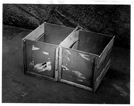 That creative focus on communication, citation, and shifting signifiers continued to interest these artists once the Nest unraveled in 1979. Skersis plays with denotation and connotation in a number of works from that year that were influenced by Joseph Kosuth, especially Kosuth’s classic conceptual piece One and Three Chairs from 1965. Kosuth’s artwork draws equivalences between the actual chair the artist displayed, a photograph of a chair, and a dictionary description of that named object, and he comments in a 1970 interview that the artwork proved that “formal components weren’t important” (Kosuth 1992, p. 225).25 Skersis, noting that he and the other Nest artists considered themselves part of a larger circle that included “Joseph Kosuth, Andy Warhol, Yves Klein, and, of course, the majestic Marcel Duchamp” (Skersis 2008b, p. 15), draws a slightly different conclusion, however. His black-and-white 1979 photographic series featuring two simple wooden vegetable crates testifies to Skersis’s fascination with the displacement of objects from one semantic field to another, and the unexpected impact of the series relies almost entirely on the humorous mismatch between the various titles of individual works in the series and the primitive materiality of the stark images depicted there. As Skersis notes, the objects are simple “containers for holding items or storing or moving things around. But as soon as we call them by a different name, they transform into something else completely”.26 Although all the works in the series employ the same two rough wooden crates, the changing titles and the crates’ relative placement in the photographs occasion the appearance of “meaningful transformations that were not obvious at first”.27 Those “meaningful” differences depend precisely on our perception of the incongruity of the rough, late-Soviet, material substrate and its alleged description, an inconsistency further heightened by the cultural differences and political divisions that separated these artists from their colleagues around the world.