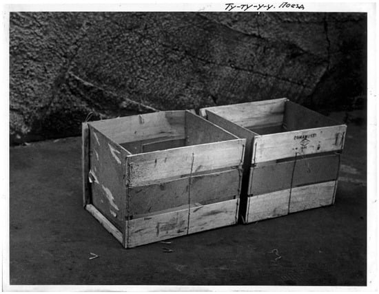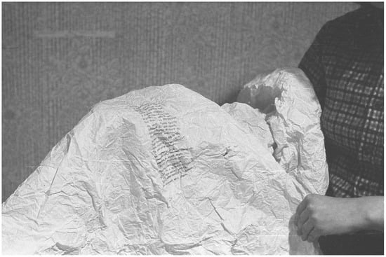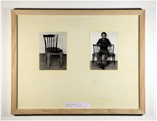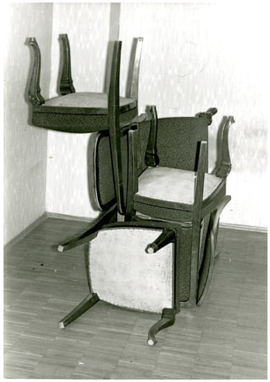 The crates—crude, impoverished, authentic, humble, honest—appear as the main protagonists in You’re President. I’m President (Ty President. Ia President) (Figure 8), Choo-choo train (Tu-tu-u-u. Poezd) (Figure 9), Peekaboo, Sweetie (Ku-ku, Pupsik), and others in the series. In Chair Wrapped in Chairs (Stul zavernutyi stuliami), another work from 1979, Skersis again makes a point of materiality by exploring what he calls the “interference” of influence from both Kosuth and Christo (Figure 10).28 The resulting homage emerges as uniquely late-Soviet in its absurd, brutal, inconvenient, laughable (in)consistency. Skersis’s 1980 work Chair. Photograph of a Chair. Definition of a Chair extended this creative dialogue even further by substituting three blank pieces of paper for Kosuth’s original chair, photograph, and definition. By including the work in the first volume of the famous MANI archive Skersis made it generally available to “friends and acquaintances and even strangers” (Danilova and Kuprina-Lyakhovich 2017, p. 236).29 Far from being irrelevant or redundant, the work’s material content, visual depiction, and characterization are now essential to the meaning of the collaborative work, contingent on individual contributions and shared interpretation.