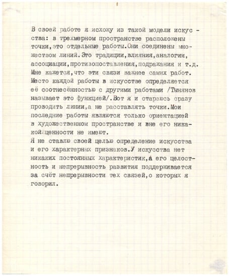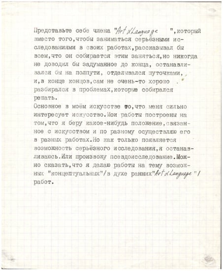 The Onegin stanza is a decidedly unorthodox form to adopt for the first in a series of works Albert dedicated to the “mastery and interpretation of certain positions taken by the avant-garde of the end of the 1960s and the beginning of the 1970s”.30 His decision to employ the complicated poetic form to explore one of Kosuth’s most anti-material pieces, however, is an early example of his committed investment in carefully rendered texts, physical labor, and directly manifested materiality as part of his artistic process. The effort of exploring Kosuth’s prose was itself a painstaking and time-consuming process, which he was able to complete only thanks to a collaboration with Nadezhda Stolpovskaya, who remembers devoting months at a time to the unavoidably laborious translation of such works.31 Conveying Kosuth’s abstract thoughts in a strict rhythm and rhyme scheme in Russian and preparing the complicated typescript required considerable additional time and effort. Yet such meticulous work with material was clearly essential to both artists’ understanding of practice, as the other pieces in Albert’s series—translations of excerpts from Terry Atkinson, Bernar Venet, and Robert Morris—demonstrate. Each of the other translations is presented in prose, but they are carefully typed and prepared for exhibition along with the conscientiously prepared, handwritten drafts. Such textured and deeply personal investment in the artistic process results in the artist’s intense engagement with his material, almost against common sense and his own anti-material wishes, yet such embodied performance is crucial to his work too. In a pattern that would reoccur repeatedly over his career, Albert chooses to express his conceptual discoveries in carefully rendered, highly individualized, and often deeply inconvenient fashion, as though the meaning of each work depends on his commitment to the assiduous rendering and performance of it.