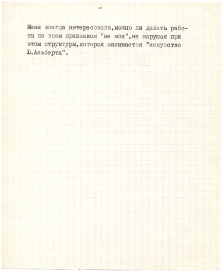 Albert expands on that notion in his open-ended Autoseries, an extended set of textual works begun in 1979. The series consists of short, typed statements originally conceived as conceptual works to be signed, framed, and exhibited under glass. Spectators would then “complete” these texts by imagining the artworks the artist describes. Yet these pieces evolved beyond their intended role as classically conceptual texts when they appeared out of context as commentary on work by Albert generally.36 Albert worried that such a shift would deprive them of their status as conceptual works of art in their own right, but it does not, of course: their ability to move seamlessly from work to commentary to work establishes them definitively as postmodern texts. It is precisely such works and Albert’s studied production of them that help locate the artist in the pantheon of modern art. As he notes in the 1981 Autoseries II, “Art has no permanent features: its unity and continuous development are the result of the continuity of ties” that unite “traditions, influences, analogies, associations, contrasts, imitations, and so on” (Figure 17). Proceeding with a model of art that emerges from “three-dimensional space”, Albert imagines a map of sorts, on which individual artworks are the constantly shifting points of the compass. These individual works are connected by the “multiplicity of lines” representing that complex of influences, Albert continues, and his goal is to “connect those lines without leaving any [fixed] points” of his own. To attempt that feat, he creates works that incorporate real and immediate yet decidedly temporal gestures. Thus Autoseries I imagines an artist who plans to undertake serious research in his works, but “never brings the concept to a conclusion”, and insists that “fundamental to my work is that art interests me greatly” (Figure 18). Autoseries II refers pointedly only to Albert’s “latest works”. Autoseries III from 1984–1985 (Figure 19) conceptualizes a work that is “not mine” but nevertheless“ does not violate the structure called ‘The Art of Y. Albert.’ ” Such works diverge significantly from the personazhnost’ that Victor Tupitsyn and others identify as a characteristic of Moscow conceptualism. Tupitsyn argues that “the camouflaging of the authorial ‘I’ became […] rather typical for Moscow communal conceptualism” (Tupitsyn 2009, p. 60), but Albert’s goal is investigation rather than camouflage, and the records he produces of those experiments exist as valid, concrete, material reflections of his continuing artistic evolution.