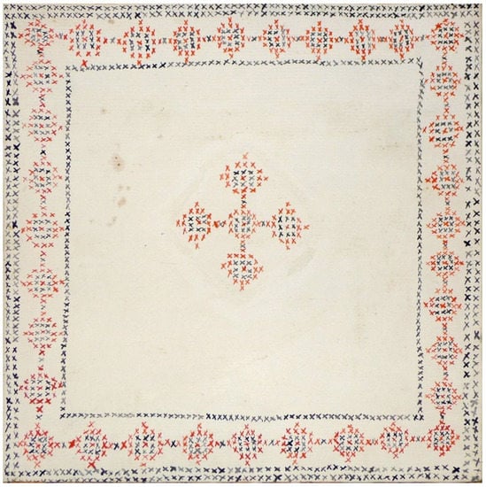 The painting itself, executed in oil on canvas 80 × 80 cm square, manages to contribute to several artistic traditions simultaneously. Most obvious is the role the work seems to adopt as decorative handiwork, like that done for centuries by Russian women. Using a traditional color palette of black and red, Stolpovskaya recreates a cross-stitch pattern classic to embroidery of the region, featuring a cross in the center of the “cloth” that is repeated in a decorative border around the edge of the canvas. Scrupulously reproduced, the traditional pattern uses a feminine vernacular that knowingly references the role of the woman artist and the traditional genres open to her. But Stolpovskaya’s creative use of the vernacular establishes her work comfortably in that tradition but nevertheless overturning it quietly: by using traditional motifs in her “painting to define painting”, Stolpovskaya makes the yawning difference between traditional modes of expression and her own radical reconfiguration of art unmistakable.