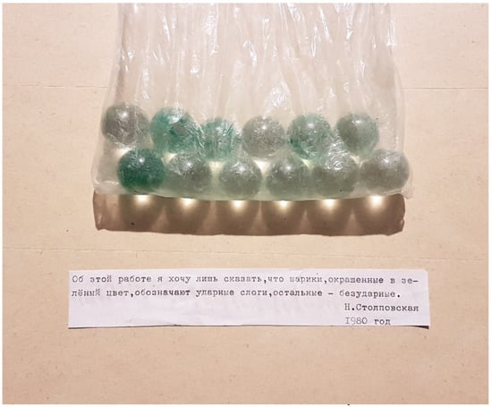Stolpovskaya’s handling of the assignment to produce a work of poetry results in her equally sure-footed Poem (Stikhotvorenie) (Figure 22). Noting later that “with every one of their works”, Albert, Skersis, and Zakharov had “hypothesized an answer to the question ‘What is Art?”,38 she engages easily with that same inquiry, answering it on her own terms. Her response to Albert’s request is phrased, as always, as an ongoing process that engages spectators and leaves final reactions to them. Thus, for the assignment to produce a work of verse, she creates a collection of small glass globes that comes with instructions: “About this work I want to say only that the globes painted green are stressed syllables, while the unpainted globes are unstressed”. With this small gesture, Stolpovskaya again manages to expand, rather than violate, the boundaries of her own art practice by opening the work of art to spectators for direct tactile, auditory, and intellectual engagement on their own terms.