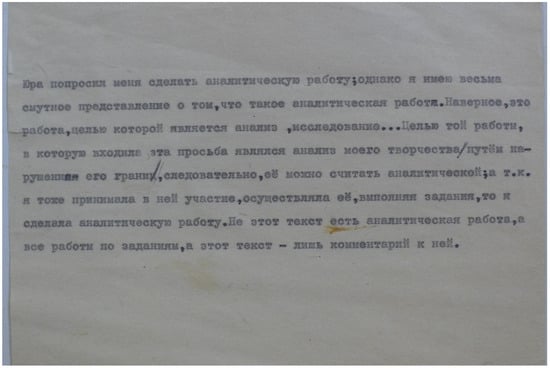 Charged in the eighth “assignment” to overstep her own approach by creating an “analytical work”, she feigns confusion before announcing that her participation in the project itself is that very investigative process. In Analytical Work (Analiticheskaia rabota (Figure 23), she thus declares “This text is not the analytical work”, but “all the works themselves”. As she mentions in an interview with Vadim Zakharov, Stolpovskaya notes that “the spectator is very important to me and my works”, including physical contact with the artworks themselves. Noting her interest in work by Walter de Maria, Bruce Nauman, Robert Morris, Richard Serra, and others, she emphasizes the role of the viewer—or reader—of Nauman’s monitors in particular, arguing that “without the spectator, the work doesn’t even exist”. Eschewing any complicated “subtext” to her works, “most likely as a reaction to the Moscow environment”, Stolpovskaya concludes that she considers a work “successful if the structure of the work transmits the structure of the depicted object”. For that, she notes, it is essential for the viewer to “open the work fully, to experience its materiality”.39 That helps explain her focus on the mundane and common, on processes of everyday life accessible to everyone who takes the time to engage with them.