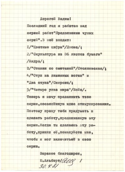 Albert engages Zakharov directly in a letter from 30 April 1981 in which he requests that Zakharov conceive of, carry out, and then send him a work to continue that artist’s work Stimulations, itself a profoundly tactile and collaborative series. The typed letter Albert sends to Zakharov documents Albert’s request and makes it clear that Albert will include whatever work Zakharov produces into his own series. In anticipation of such co-authorship, Albert continues his own textual explorations of the meaning of art in context by imagining a work of art that would hang “between Nadia Stolpovskaya’s Table Covered with a Tablecloth and Vadim Zakharov’s Stimulation series”. This, then, is the work that Albert creates by suggestion in his letter to Zakharov (Figure 25). Its exhibition makes it clear that this curated artistic community, ongoing conversation in and about it, and contextualized meaning are essential to the analytical branch of Moscow conceptualism.