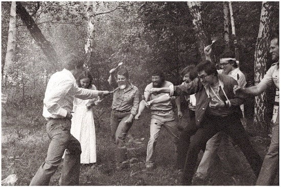 Nest artists continued to focus attention on the physical, concrete, and literal in their path-breaking performance piece Hatching a Spirit (Vysizhivanie dukha) (Figure 1). The work, exhibited publicly for the first time at the watershed VDNKh exhibit in 1975,16 played consciously on the amorphous spirituality that characterized much of the Russian avant-garde and late-Soviet unofficial art as well. But the Nest replaced exalted calls for ephemeral spirituality (dukhovnost’) with a real egg in an actual nest of leaves and branches that announced the artists’ freedom from both official and disembodied unofficial art and issued a general invitation for others to join them in the generation of embodied artistic meaning. Convinced they were creating “the most radical of events, even compared to things like Chris Burden’s body art”, the Nest envisioned their work as a “re-evaluation of all the principles of art” (Skersis 2014, p. 149).17 To achieve that goal, the artists made a virtue of collaboration, fully embodying their practice by occupying the nest publicly and cultivating an inclusive model of creation based on co-authorship (so-avtorstvo). Each artwork figured as a succinct and negotiated contribution to an ongoing dialogue intended as neither authoritarian nor sectarian but open and democratic.