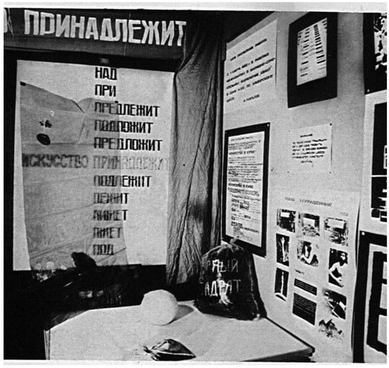 Descriptions of Moscow conceptualism have generally focused on disembodied and dematerialized artworks, particularly the ephemeral and esoteric works of Ilya Kabakov, Andrei Monastyrski’s Collective Actions, and others, to the exclusion of more direct, materially grounded, and collaborative conceptual work. Primed to see the effects of Soviet “logocentrism” everywhere, observers have frequently treated the substitution of text for object as a near inevitability in the post-Stalin era, explaining it as an expected outcome of the “hypertrophy of the text” that supposedly accompanied the “atrophy of the image” (Debray 2007, p. 12) throughout the post-war Soviet bloc.4 Boris Groys’s assertion that “Soviet culture had always been conceptual…in its entirety” both typifies and strives to justify such an approach (Groys 2008, p. 31).5 Contending that conceptualism in Russia was characterized by the “deliberate presentation of ideas denuded of their material referent”, Mikhail Epstein argues that “pointing to [such] emptiness” is what distinguishes conceptualism in Russia from its Western counterpart (Epstein 1995, p. 35). Leaving minimal traces of its physical existence, such disembodied work is often deliberately detached from its surroundings, unforthcoming or deceptive about its origins, stripped of materiality, and focused on thought and cognition over everyday process and negotiated real-world practice.