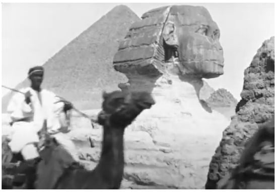 The utter stillness of the monument can be contrasted with the movement of another film of a sphinx: the 1897 short film by Alexandre Promio entitled Les Pyramides (vue générale) [see Figure 2]. Promio was engaged by the Lumière Brothers’ company and had set off over two months to capture films of some of the world’s most celebrated monuments. He arrived in Alexandria, travelled to Cairo, Giza and along the Nile to Upper Egypt. Les Pyramides (vue générale) “consists of a single almost 50-s shot that displays various layers of a sort of visual archaeology, divided into three planes: in the first, a row of travelers moving across the frame; in the second, the face of the Sphinx; and in the third, the towering pyramid” (). With the Great Pyramid in the background and the Sphinx at the centre of the scene, it is the first of these planes which most aptly emphasizes the life and duration of the film.