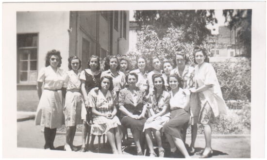 Photograph of students at the Higher Institute Women Teachers of the Fine Arts in Bulaq circa 1947–1949, with Menhat Helmy seated at the far right with their art teacher, seated second from left; Menhat’s sister Reaya, also a student at the school is standing at the far left. The photograph may also be showing Gazbia Sirry. Courtesy of estate of Menhat Helmy.