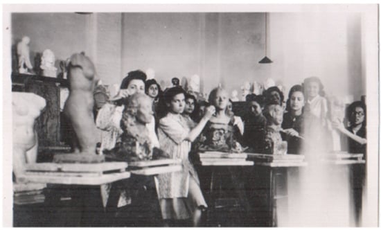 Table 1 shows a chronology of the separate art academies or schools of art in the neighborhoods of Bulaq and Zamalek in Cairo at which men and women were studying between 1928 and the 1950s7. Figure 1 shows a photograph of students at the HIWT in Bulaq circa 1947–1949. Where the fine arts schools fulfill an ideological role for the Egyptian ruling class, the industrial applied arts have their own pedagogical history that conforms to the need to establish a working class. In Bulaq a school of arts and royal industries was established by Muhammad Ali in 1839. A separate set of applied art schools were also established, including the Khedival School of Arts and Crafts (1910) and reorganized and renamed several times: al-madrasa al-`ulya li-l-funun al-tatbiqiya (The Higher School of Applied Arts) (1941) and again in 1953 as the Kulliyat al-funun al-tatbiqiya (The Faculty of Applied Arts) (Shehab and Nawar 2020, p. 45). A fuller study of the history of these schools and the experience of women at the College of Fine Arts compared with these other institutions would be useful for scholars, including more on the curriculum and languages of instruction.