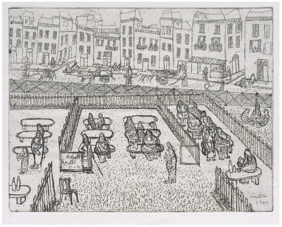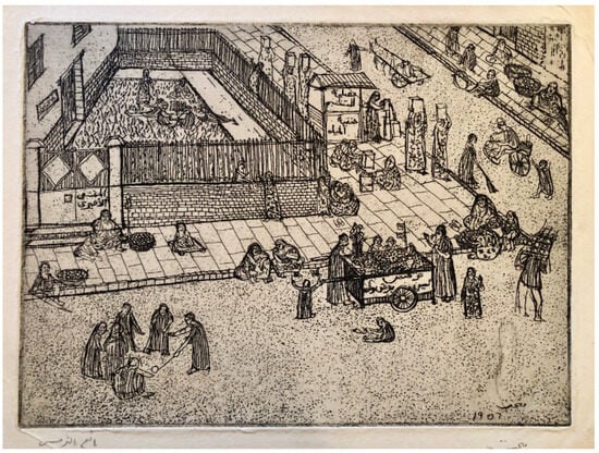 In the Lupin Seller (Figure 10) we find various small vendor stalls surrounding a school with signs announcing their products. In the distant middle of the street, is a water seller at a stand with two signs. The sign above advertises this as medicinal water, and perhaps the vendor’s name below: “Hanifiyya’s Water.” Walking in procession toward the stand are several women bearing water cans on their head, perhaps bringing fresh water to the vendor who uses additives or herbs to freshen the water. This suggests women are perhaps working for or selling to the vendor. Several other women are shown carrying water cans away from the stand, shown as customers of the vendor. Perhaps the women are bringing these as empty cans to be filled up and then taking them home. Alongside the vending stand are two seated figures with a water can. The title of the etching names only one location of this wider scene of women, men and children shown moving about the vending stalls, with young children at play or seated beside a mother seated alone in the left foreground selling some food items. The use of metal cans for these water sellers is a shift in material from the water skins used in earlier periods by vendors (Maʼmūn 2014) and the qila or pottery jugs used to hold and carry water made in Upper Egypt (Koptiuch 1999). As with the substitution of plastic arusa dolls for the sugar baked dolls, or of plastic and mass-produced metal wares that replaced pottery, these shifts in material production reflect the changes in petty commodity production that altered the nature of work and tradecraft (Al-Shal 1967). These metal water cans were possibly a surplus from the German and British military stocks used during World War II and continuing through the early 1950s. A viewer may infer the hardship of bearing water cans to be a sign of a lack of public fountains, pumps or running water.