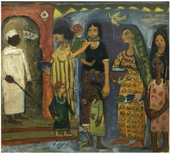 The second painting on display at the Barjeel exhibition, and similarly entitled Clinic, (1958) (Figure 8) is by Mariam Abdel-Aleem, (1939–2010) also a distinguished graphic artist, and among the first women graduates in 1954 from the Zamalek based College of Fine Arts College, and whose career was recognized in Fathy Ahmad’s book on Egyptian graphic art (1985). There are remarkable parallels between the two paintings. As in Helmy’s etching we find in Abdel-Aleem’s painting, a solitary male figure with a cane, probably blind, who is leaving the entry way to the clinic where the women are shown waiting in line with their children. The suggestion in Abdel-Aleem’s painting is that there is a shortage of clinics or doctors, hence the long waiting line. The closely modeled theme and accentuation of disabled elderly male figures with waiting women patients in both paintings strongly suggests that both artists were in a collaborative dialogue on the importance of the theme and subject of the elderly, women, and children’s health. These paintings may be viewed alongside continuing journalistic efforts for women’s causes. It was the very issue of women’s health and paid maternity leave that their fellow artist Inji Efflatoun had raised in one of her 1958 newspaper articles on the productive role of women in the workforce (Efflatoun 1958).