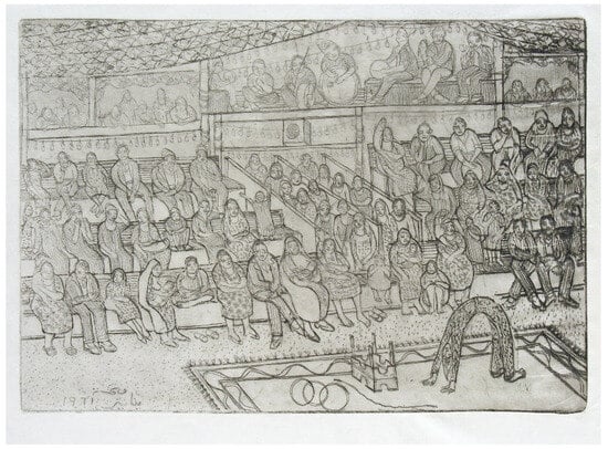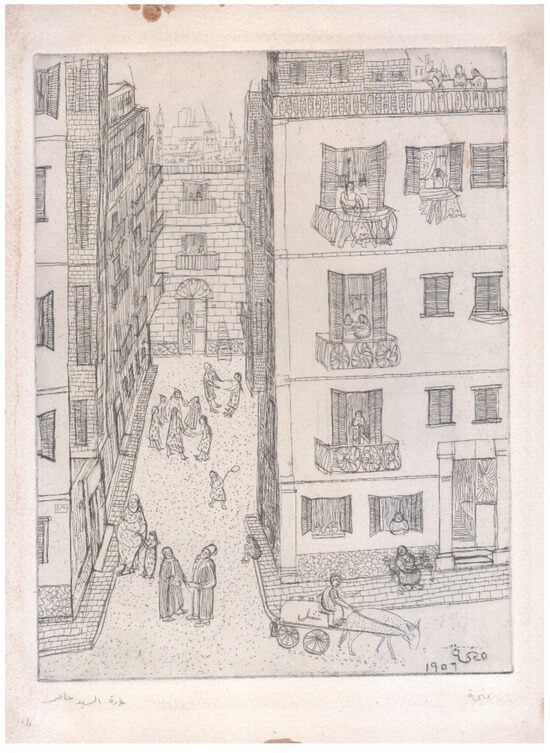 Another set of delicately rendered etchings were dedicated to the mawlid festivals of the neighborhood, the popular sugar doll given to children, and other settings used to celebrate the Prophet’s birthday or on other occasions, the mawlid of local saints. These were subjects found among other artists of this period, including Abdel Hadi El-Gazzar and Jamal El-Seguini, and were admired by the artist and art critic Mostafa Al-Razzaz, who also noted that Helmy’s locations of scenes located along the Nile, to the southwest of Bulaq, between Giza and Zamalek, as resonating with places found in Mahfouz’ novels, notably tharthara fawq al-nil (Adrift on the Nile, 1966) and his Cairo trilogy (1956–1957) (Al-Razzaz 2006, p. 46). In Bulaq on the Prophet’s Birthday, (Figure 13) the artist renders the lace-like hangings of the street decorations in exquisite detail. The etching shows a command of etching point and special care and attention to the printing with the contrast of the darker building windows and balustrades, overlaid with the décor of the street festival and its preparations. The spectacle of popular arts and symbolism of gift-giving and colorful displays was given noteworthy attention by writers and in studies of popular folk arts. These included studies published around the time that Helmy was producing these etchings as in a study of the appeal of colors in popular arts (ʻAbd al-Latif 1964) and a study of the sugar doll craft industry that was soon to disappear (Al-Shal 1967). These may be compared with later studies on the wider appeal and context of the festival (Mustafa 1980) and its links with Sufism (Abu Zahra 1988).