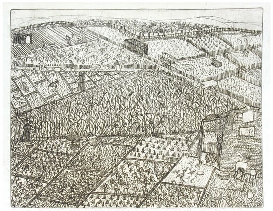 On occasion, Helmy turned out agricultural scenes with sensitivity to rural landscapes and its peasantry that commonly were found in Efflatoun’s paintings from the 1950s onward. An undated etching most likely made during the period between 1956–1966, and entitled Agricultural Production (Figure 11) in the family digital archive, shows Helmy’s interest in rural subjects. The art critic Al-Razzaz also described the title as al-intaj al-zira`a (agricultural production), that suggests a strong attention to what he considered to be the artist’s attention to socialist aspirations and conditions of Egyptian economic and social life (Al-Razzaz 2006). Applying a bird’s eye view, her sweep of the terrain and details of subdivided lands may be viewed alongside a reading of Abdel Rahman Al-Sharqawi’s social novel, Al-Ardh (The Earth). The slightly fragmented outlines of the human figures, shown at work in the different fields, seep into the land and crops that they till, so that a blending of forms, gender, and nature, are subsumed into one another. Each figural representation is indistinct from each other, rather a consensus of shared work is distributed about the entire etching. Helmy’s overview of agricultural labor, shows a marked turn from the emphasis on individual and group scenes of characters that dominated the illustrations by Hassan Fu`ad, the original illustrator for the first edition of Al-Sharqawi’s novel, originally serialized in newspapers and first printed in 1953–1954. Helmy also does not show any large estate home or any other marker of the status of the large landowners who dominated ownership and conditions in modern Egyptian agriculture up through this period. However, in the center of the scene is a triangular field that may be corn or perhaps sugar cane. It is the pattern of the fields, their subdivisions into small parcels, that dominate the composition, and there is a rather even distribution of peasant men and women around the fields, for only a cluster of three are shown tilling the rows of a new field. The scene is of a verdant agriculture, the product of the collection of workers, shown in gestural relief. The location of this rural scene is uncertain, although the art critic Al-Razzaz places her rural scenes at “el-Temsah village in Islamia Province” in lower Egypt (Al-Razzaz 2005b, p. 36; 2006, p. 48), while the family archives contain another etching with the location titled after the Upper Egyptian village of Timshayya, where her grandparent’s family originated.