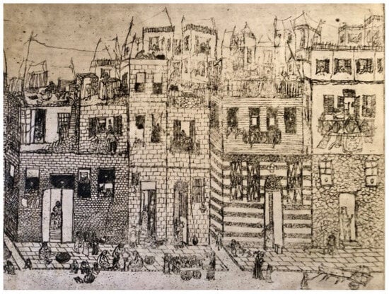 Helmy explained her choice of the neighborhood of Bulaq as a subject for her art in a 1966 interview. Noting the privilege of attending and graduating from the Slade School of Art in the early 1950s, Bulaq’s attraction as a subject was an affirmation of its resonance and influence. From the 16th to early 19th centuries, Bulaq grew as a suburb built on the shores of the Nile to the north of the city. It functioned as the working port for Cairo, connecting it to the trade of the Ottoman Empire, and became the center of shipbuilding, textile mills and other industries. The new mosque architecture and residences transformed the area into a prosperous northern suburb where a new elite relocated (Hanna 1983)11. An idealized view of Bulaq as a newer and prosperous suburb is found in the Orientalist 19th century lithograph (Figure 17) of the Masjid Abu al-‘Ila by David Roberts and (Haghe and Roberts 1846–1849)12.