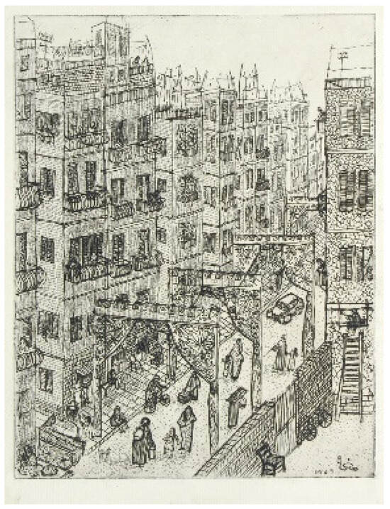 The social drawings or etchings found in Helmy’s works on the neighborhood of Bulaq, evince a comparison with the famous social novels of the period, most notably Naguib Mahfouz. It is difficult to identify another Egyptian visual artist who so clearly identifies her subjects and their neighborhood over the course of a ten to twelve year period of intensive concentration through etchings, drawings or other medium. Among the many social novels of this period Zuqaq Midaq (Midaq Alley) (1947) allows a direct comparison with several of Helmy’s etchings of the 1950s. A debate about the relative pessimism or optimism depicted in Mahfouz’ Midaq Alley was put forth by literary critics. The choice of Mahfouz to focus on a neighborhood alley in a poor part of Cairo was criticized by Mahmud Amin al-ʻAlim as a backward vision of pessimism (Al-ʻAlim 1970). This criticism was opposed by Sasson Somekh who in an ad hominin attack cites the critic’s Marxism as overstating Mahfouz’s desire for return to a glorious past to evade the realities of an ugly present (Somekh 1973, p. 67). Somekh notes the generalized portrayal of women in Mahfouz’s social novels of the 1940s and 1950s as socially imprisoned, the older women have resigned to their fate, and while the younger women have little or no real alternative to escape other than undertaking risky affairs or prostitution (Somekh 1973, pp. 80–82). By the late 1950s, Edward Al-Kharrat and other writers produced story narratives of urban life that were less dependent and capturing a purely realist depiction and turned toward a trope of psychological realism (Kittani 2013).