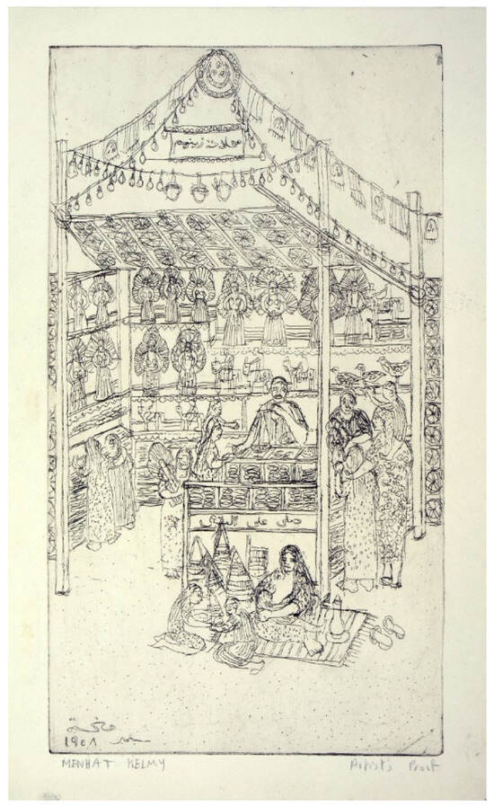 Menhat Helmy, Zeinhoum’s Market (1958). Etching, 15.5 × 21 cm. Courtesy of estate of Menhat Helmy.