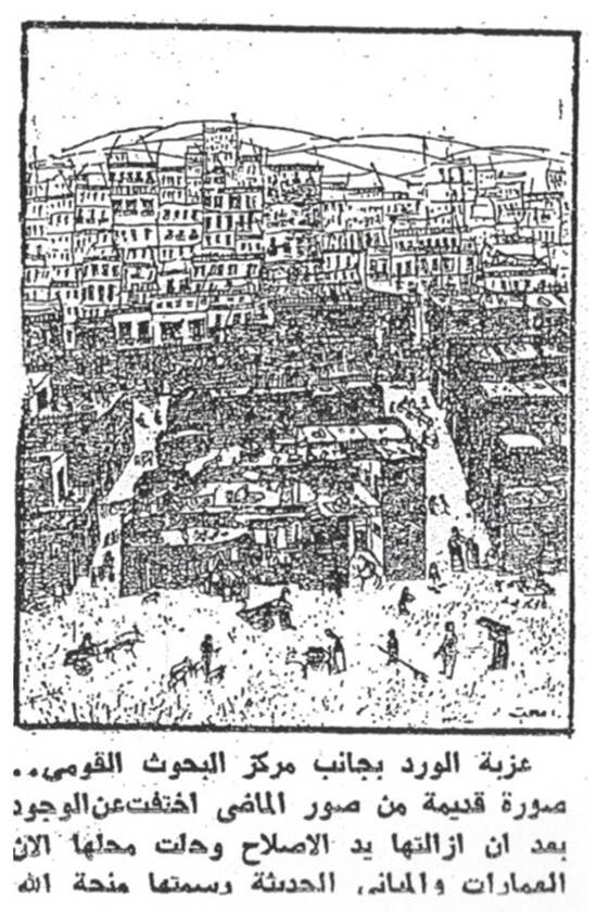 Caption from 1966 newspaper showing the etching by Menhat Helmy, entitled Ezbet al-Ward (1965).