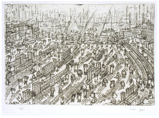A demographic and census study comparing Bulaq and Zamalek published in 1996, pointed out Bulaq’s high rates of illiteracy at about 42% (Ḥuzayyin 1996, p. 29)13. These conditions had prevailed since the Second World War as migration increased from the rural areas. When Helmy rode the bus from Zamalek across the bridges of the Nile back to Bulaq and Old Cairo on the east side, she was crossing from two vastly different neighborhoods, separated by wealth and poverty, education and illiteracy, affluent residences and poor densely populated residential areas. As a teacher she was aware of the difference between high rates of literacy in Zamalek where she taught and the prevailing level of illiteracy in Bulaq. The differences were so stark that the main reasons any illiteracy in Zamalek reached about 12% could only be attributed to its more or less, temporary workers, who worked as bellmen, doormen, and servants for its rich permanent residents (Ḥuzayyin 1996, p. 30). Helmy resolves these class differences in a visual language drawn into her etchings, just as the poor and illiterate used radio news to inform themselves of current and national events.